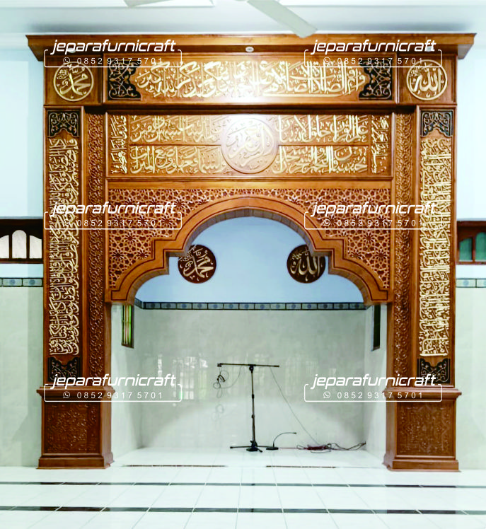 Jepara Furnicraft hadir dengan menawarkan berbagai Model dan Motif Mihrab Masjid Jati Ukir Jepara yang bisa saudara temukan dengan memudahkan saudara untuk melihat detail dan juga model yang banyak diminati oleh para konsumen yang telah kami kerjakan dengan bahan baku kaju jati pilihan terbaik. Salah satu model yang banyak diminati adalah model sederhana dengan variasi ukiran yang menghiasi seluruh bagian mihrab. Sebagian besar ukiran yang diminati adalah ukiran kaligrafi serta ayat suci al-qur-an dan kombinasi ornamen geometrik yang dibalut dengan finishing warna gold dan juga natural. Selain itu, beberapa motif model mihrab masjid lainnya juga bisa saudara dapatkan ditempat kami seperti model mihrab dengan ukiran berbagai bentuk dan desain serta ornamen yang bakal membuat ruangan masjid semakin mewah dan indah.